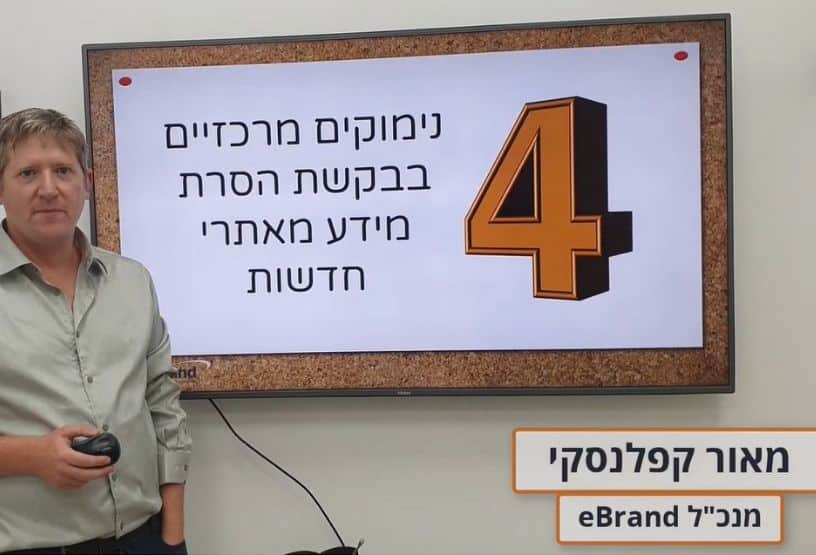 אתרי חדשות מפרסמים ידיעות רבות בכל יום, את זה כולנו יודעים. מה שלא כולנו יודעים, זה שהידיעות האלה לא נמחקות ממאגר הכתבות באינטרנט, והן נמצאות שנים על גבי שנים בתוך האתרים. כאשר מדובר על כתבות חדשותיות נטו, אין הדבר פוגע באף אחד, אך מה עושים כאשר מתפרסמות ידיעות עם ניחוח שלילי או מידע בעייתי על אדם, ארגון או חברה? בסרטון הבא, מאור קפלנסקי, מנכ"ל eBrand מפרט מהם ארבעת הנימוקים המרכזיים כאשר מנסחים בקשה להסרת מידע מאתרי חדשות.